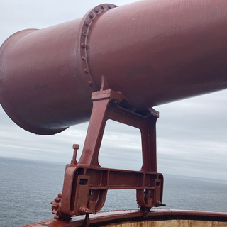Down a steep staircase on the south side of the peninsula is the lighthouse’s foghorn; a massive piece of kit with a warning light to not approach when it is sounding. The equipment for the foghorn include two large tanks for the compressed air used to sound the foghorn, and the trumpet (?) of the horn is mounted on a circular track so it can be pointed in almost any direction away from the land.